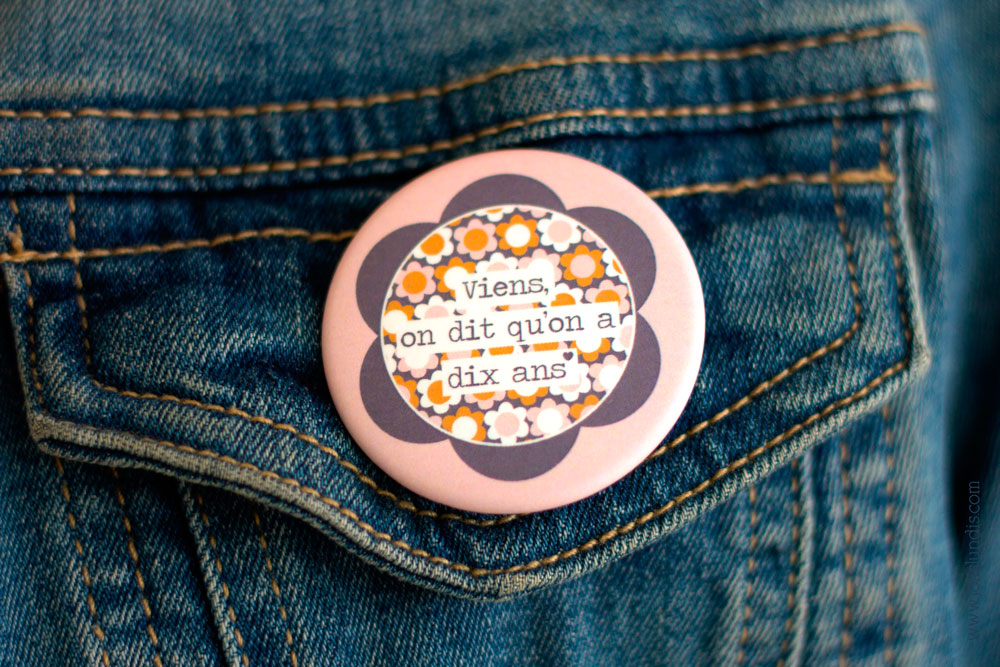 Grâce à la magie des mots, le badge «Viens, on dit qu’on a dix ans», à offrir ou à garder pour soi, agit comme un doux rappel en invitant à se reconnecter à son enfant intérieur dès que les yeux se posent dessus où qu’il soit accroché: sur une veste, un sac, un plumier,…