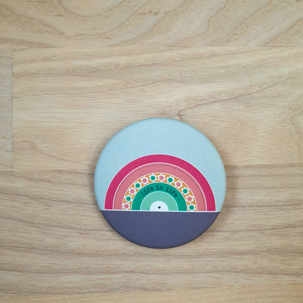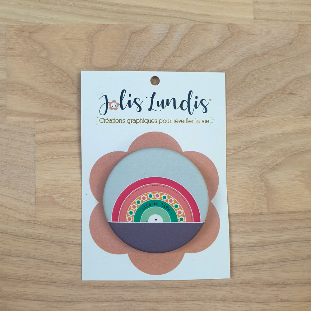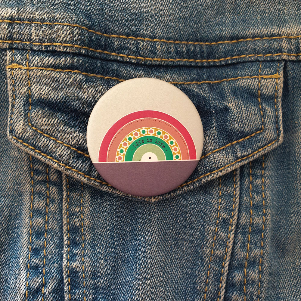 Grâce à la magie des mots, le badge « Life is life »,  à offrir ou à garder pour soi, agit comme un doux rappel en invitant à relativiser et lâcher-prise dès que les yeux se posent dessus où qu’il soit accroché: sur une veste, un sac, un plumier,…