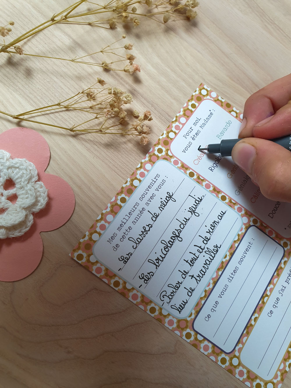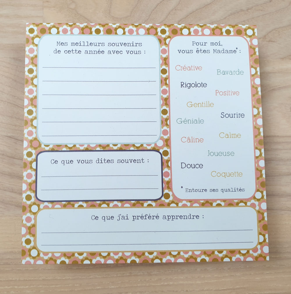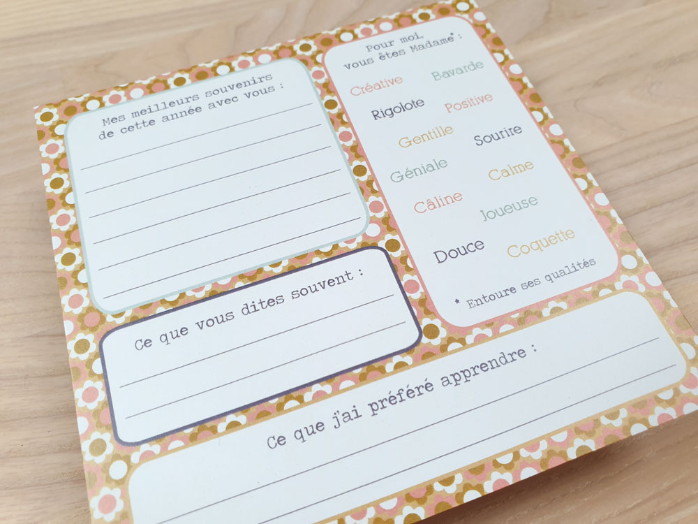 Grâce à la magie des mots, en personnalisant la carte « à remplir pour les instits », votre enfant pourra lui expliquer ce qui, pour lui, a rendu cette année exceptionnelle et inoubliable. Une façon originale de conserver les souvenirs et de dire merci.