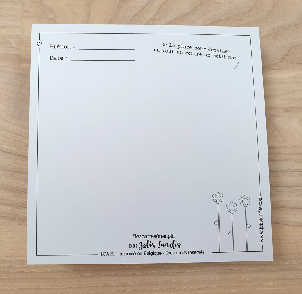 Créée et imprimée à Villers-le-Bouillet (en Belgique), cette carte se différencie grâce à son format carré (11.2 x 11.2) et à son papier choisi avec soin pour un rendu mat (sans vernis) aux couleurs douces. Son grammage de 300g/m2 permet, de plus, d’écrire sans qu’elle ne transperce.