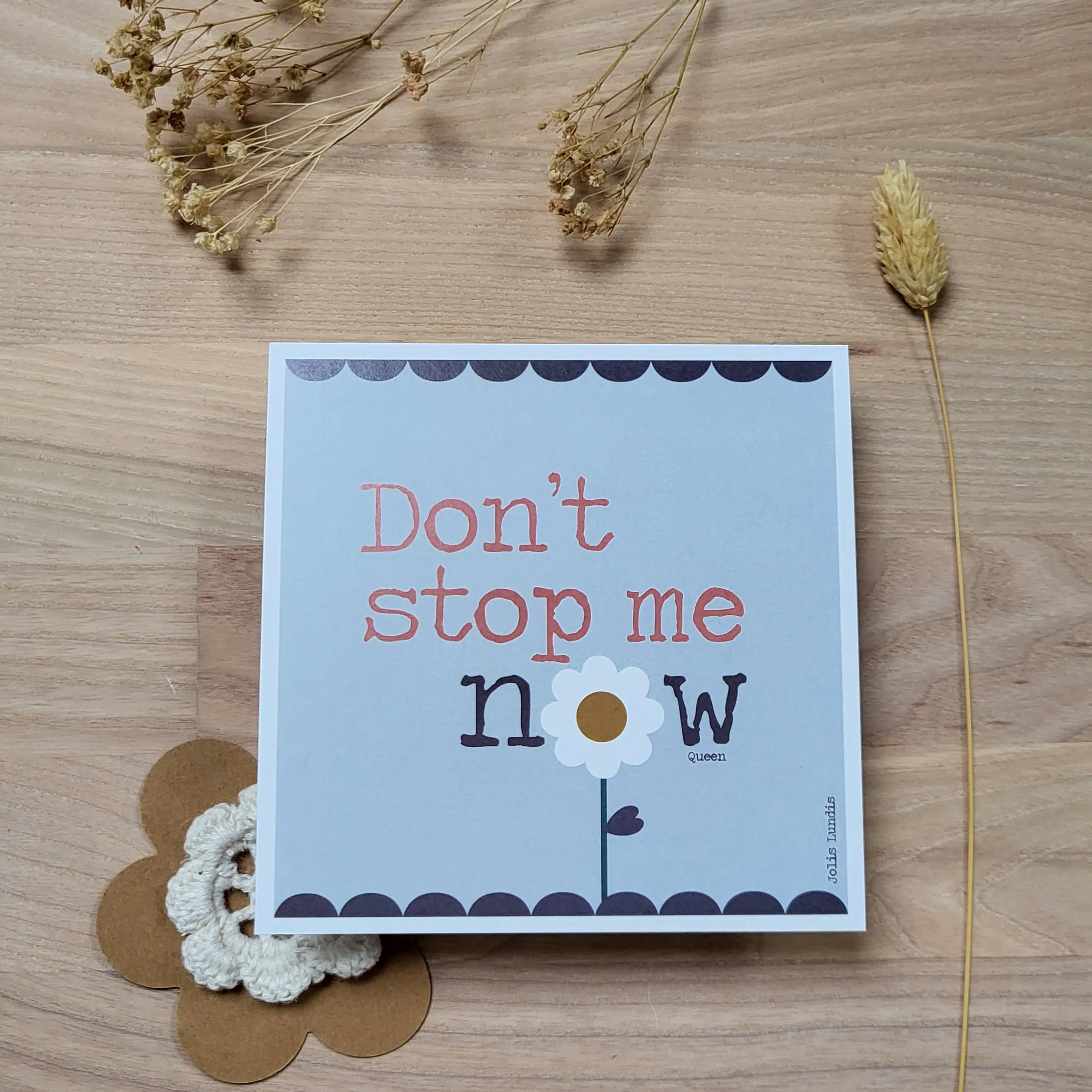 Posée sur un bureau, une étagère, un frigo, la carte « Don’t stop me now » est un joyeux rappel de continuer sur sa lancée, de ne pas freiner la joie qui porte