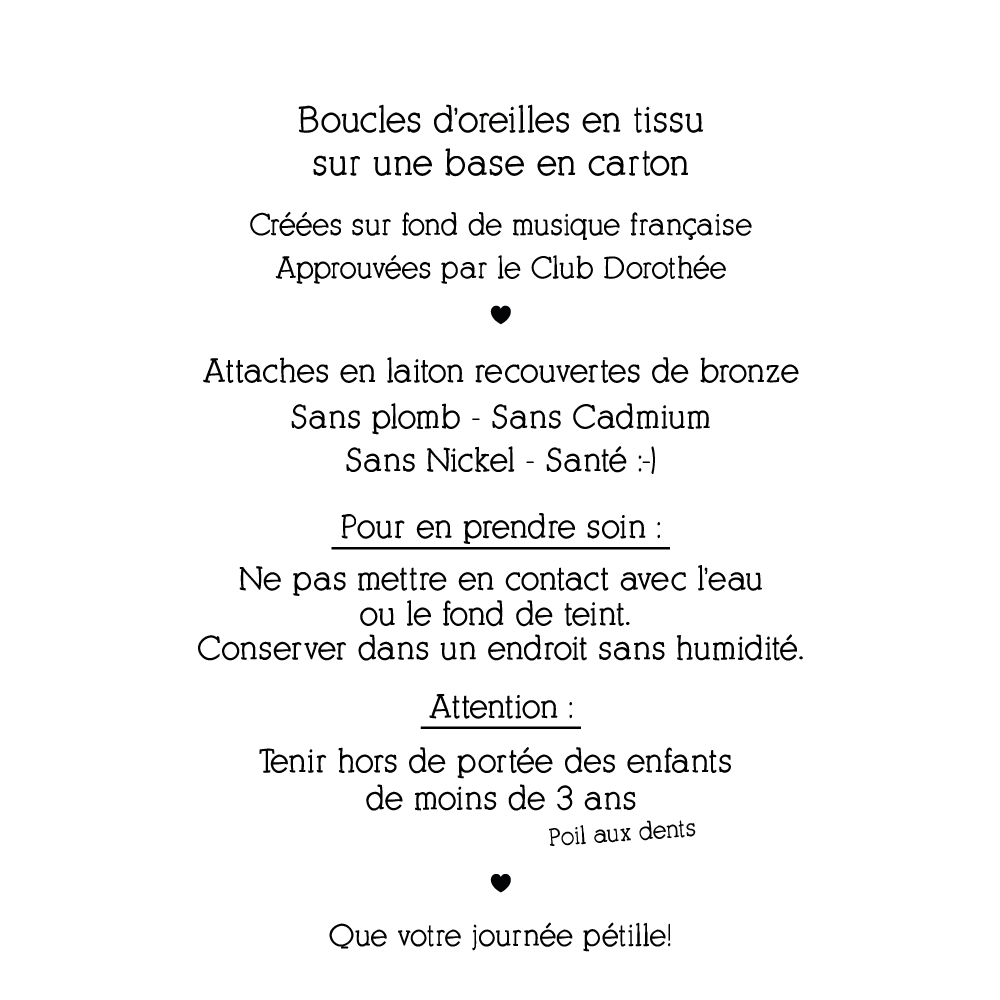Veuillez noter que les motifs des boucles d’oreilles peuvent varier en fonction de l’endroit où le tissu est découpé. La photo est à titre illustratif et n’est pas contractuelle.